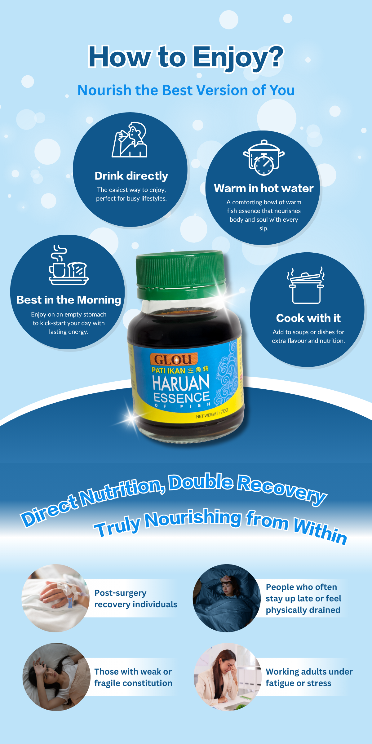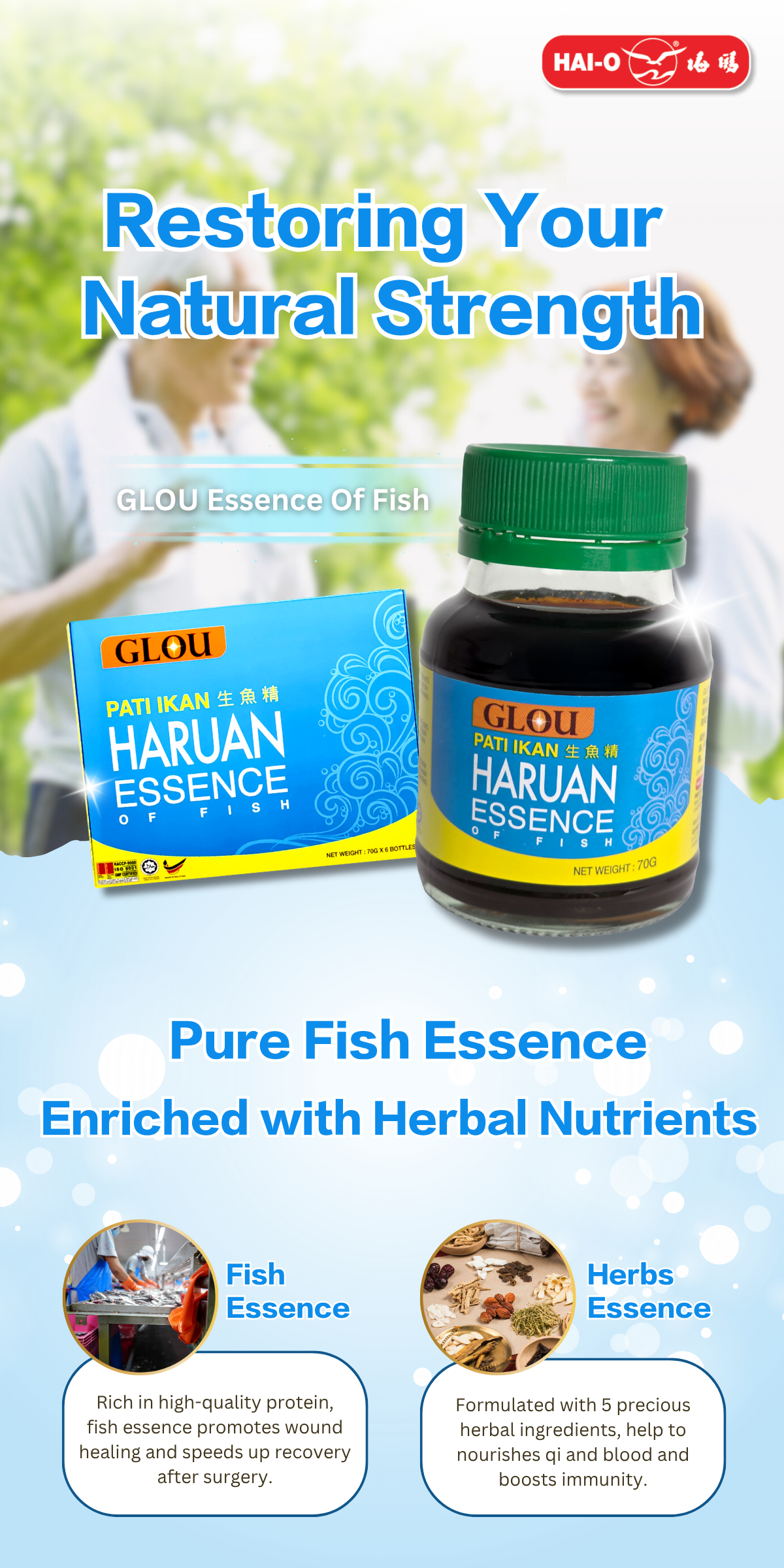 GLOU Essence of Fish is made from the freshest quality fish and 5 types of precious medicinal herbs, refined and condensed using the latest scientific methods. This product does not contain any cholesterol, artificial colouring or preservatives.