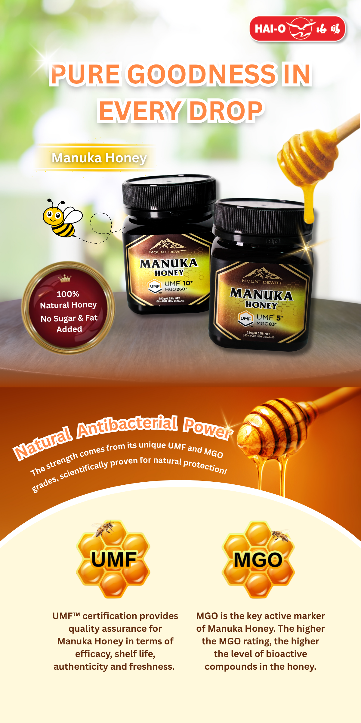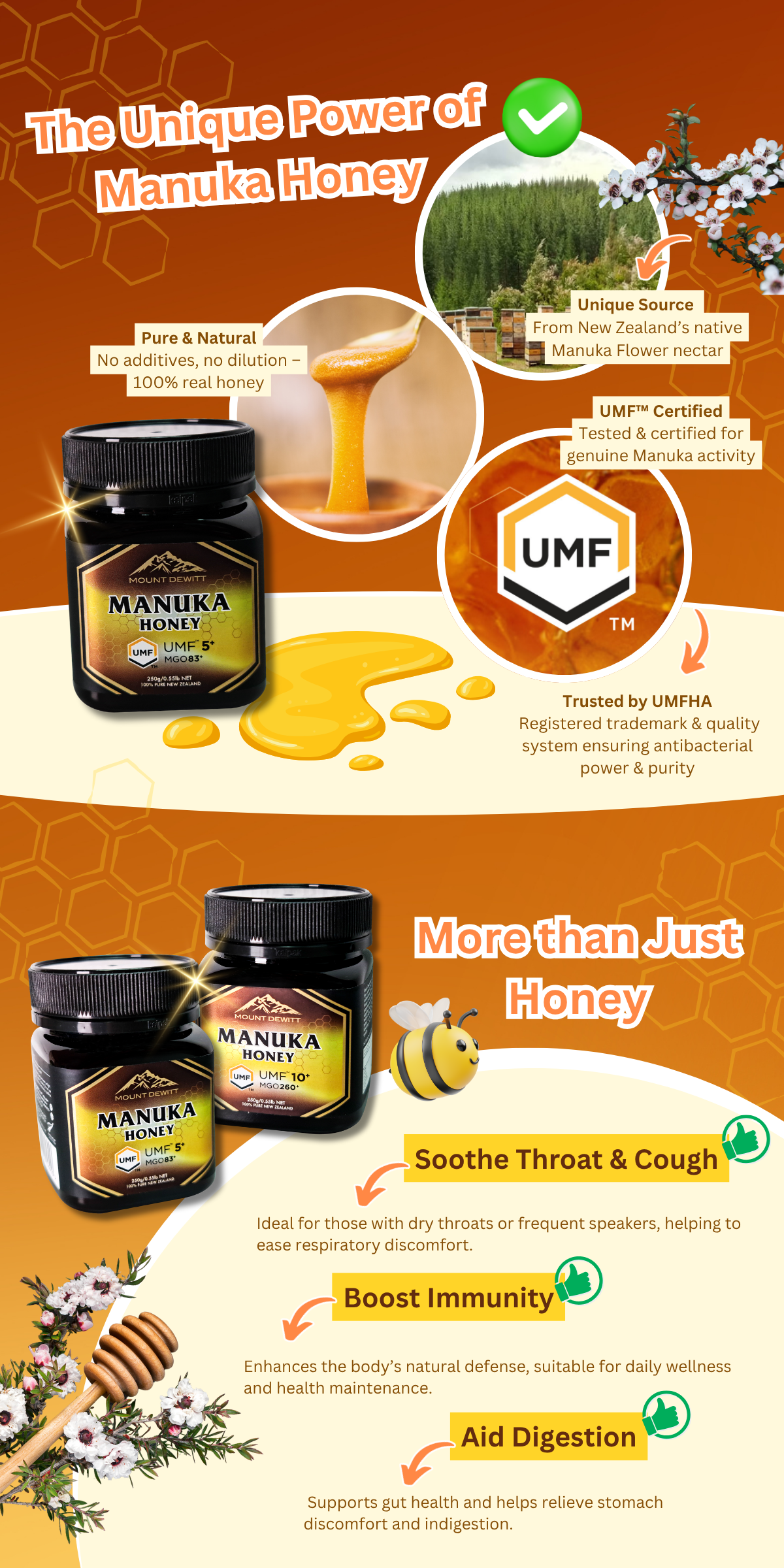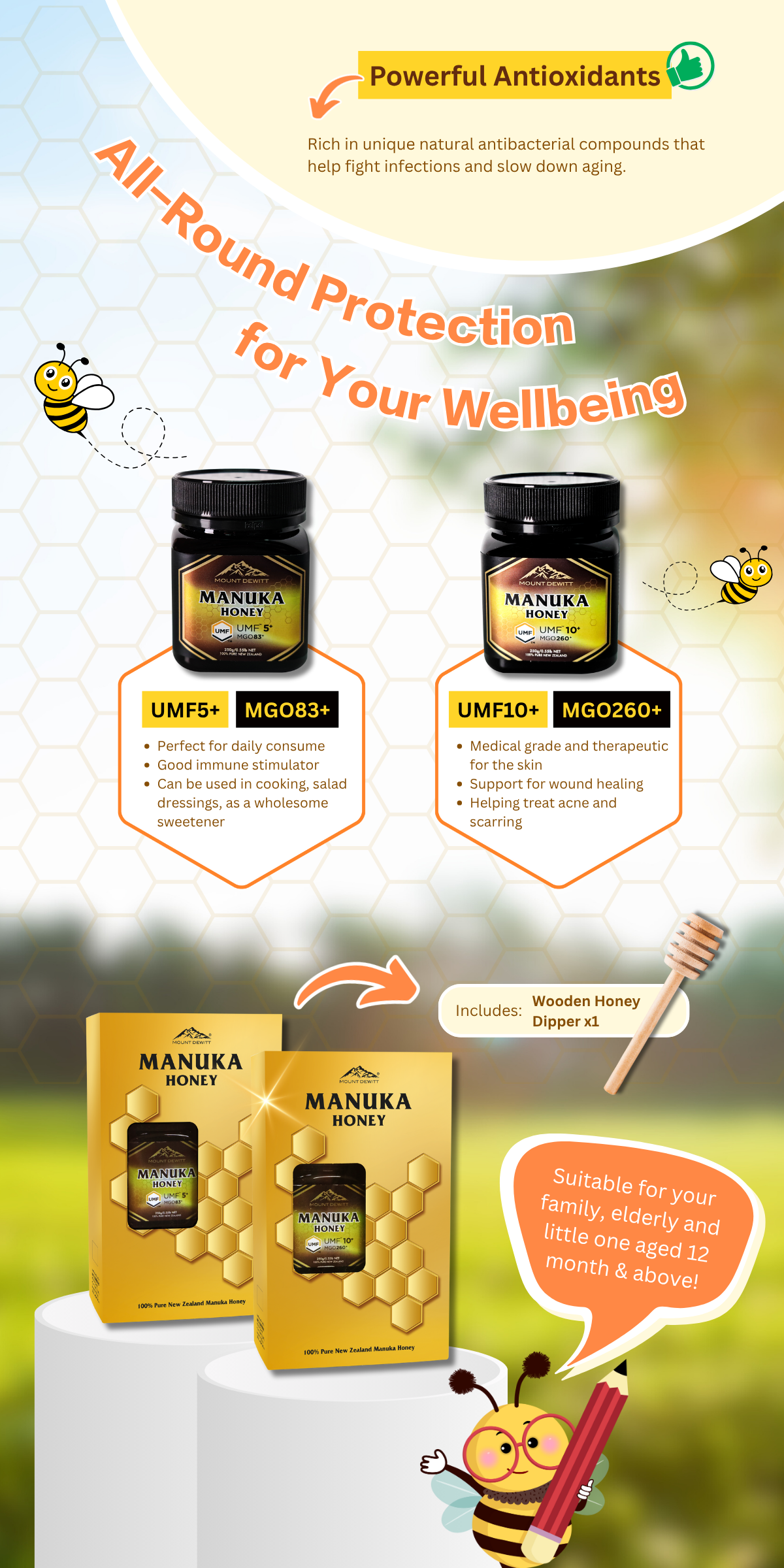 Manuka Honey is world renowned for its unique properties and we take great pleasure in supplying Honey that is great taste, texture and is also UMF™ rated and MG tested at a certified New Zealand laboratory to guarantee exceptional quality.